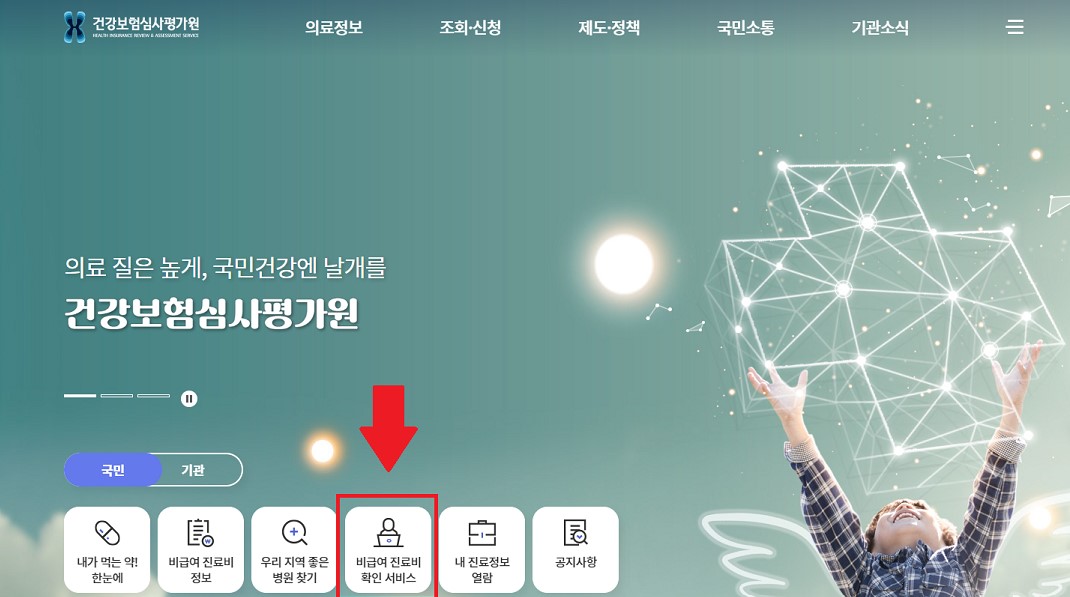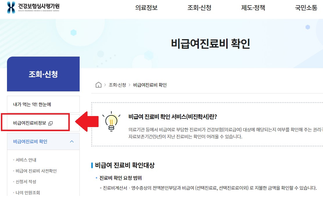 메인 화면에서 '비급여 진료비 확인 서비스' 를 클릭해서 들어갑니다.