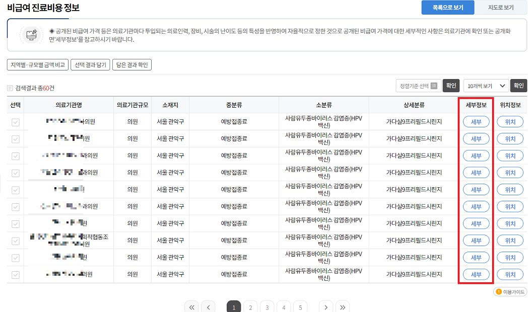 동일한 서울시 관악구 병원이어도, 접종비용이 모두 다른 것을 확인할 수 있습니다.